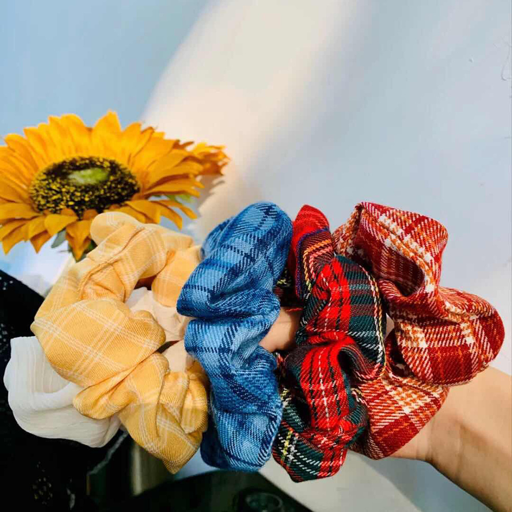 / New JK plaid large intestine ring hair ring Korean version ins fabric floral headband forest series ponytail satin headdress female